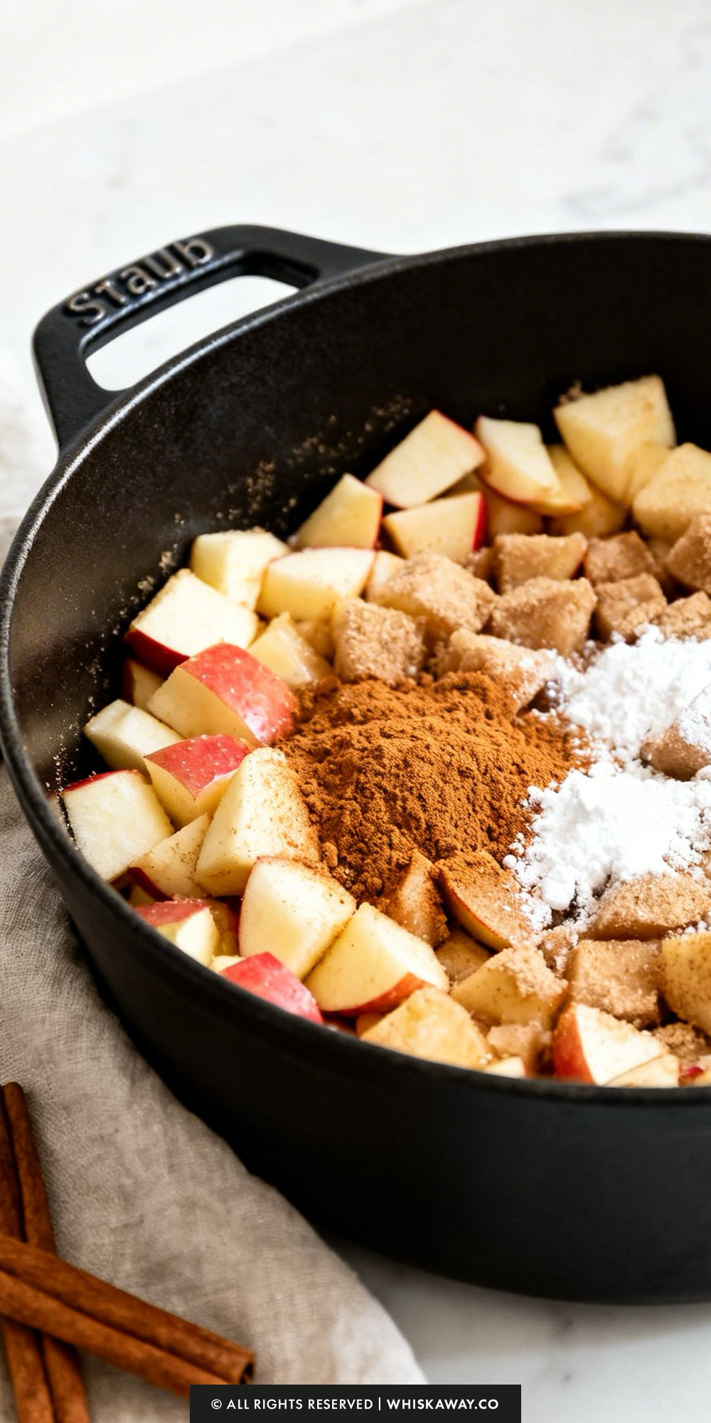 - In a medium skillet over medium-low heat, combine the diced apples, brown sugar, butter, cornstarch, and cinnamon. Stir often until the butter melts and the sugar dissolves.