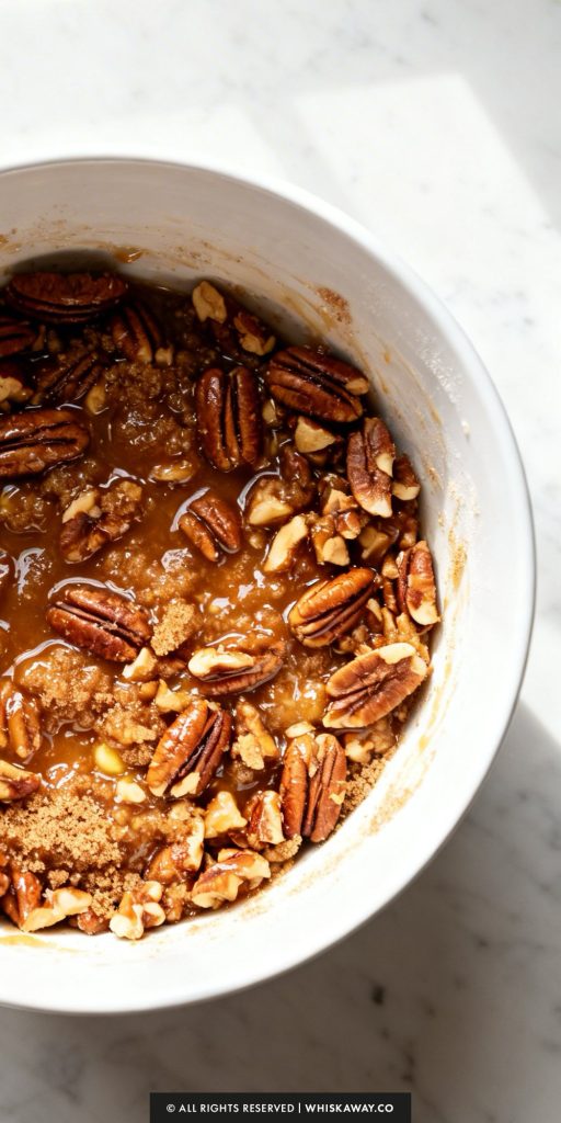 - In a small bowl, combine the remaining brown sugar and melted butter. Stir in the chopped pecans until the mixture is well combined.