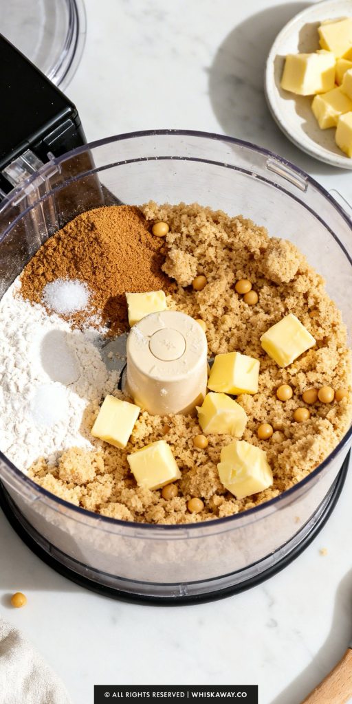 - Add the butter cubes to the food processor and pulse until the mixture resembles fine crumbs with tiny pea-sized pieces of butter remaining.