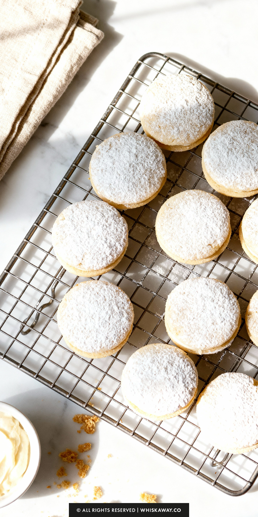 Pipe the coconut frosting around the edge and place the curd in the center. Too much curd can make the cookies slippery; too little may make them dry.