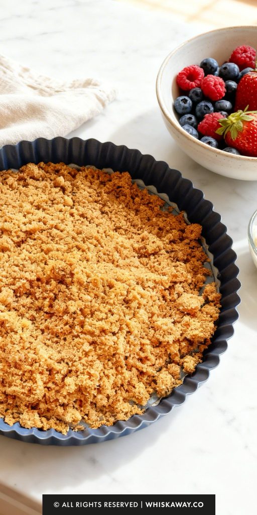 - In a mixing bowl, combine the graham cracker crumbs, melted butter, and sugar. Stir until the mixture resembles wet sand and the crumbs are evenly coated. Transfer the mixture to a tart pan, pressing it firmly into the bottom and up the fluted sides to create a solid shell. Refrigerate the crust for at least one hour to allow the butter to solidify and set the base.