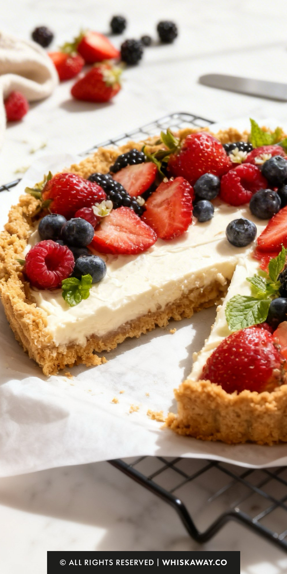 You can prepare the crust and the filling up to 24 hours in advance. In fact, a longer chill time often leads to a better set and easier slicing. However, wait to add the fresh fruit topping until you are within 2–4 hours of serving to keep the berries looking vibrant and to prevent them from releasing juices into the cream.