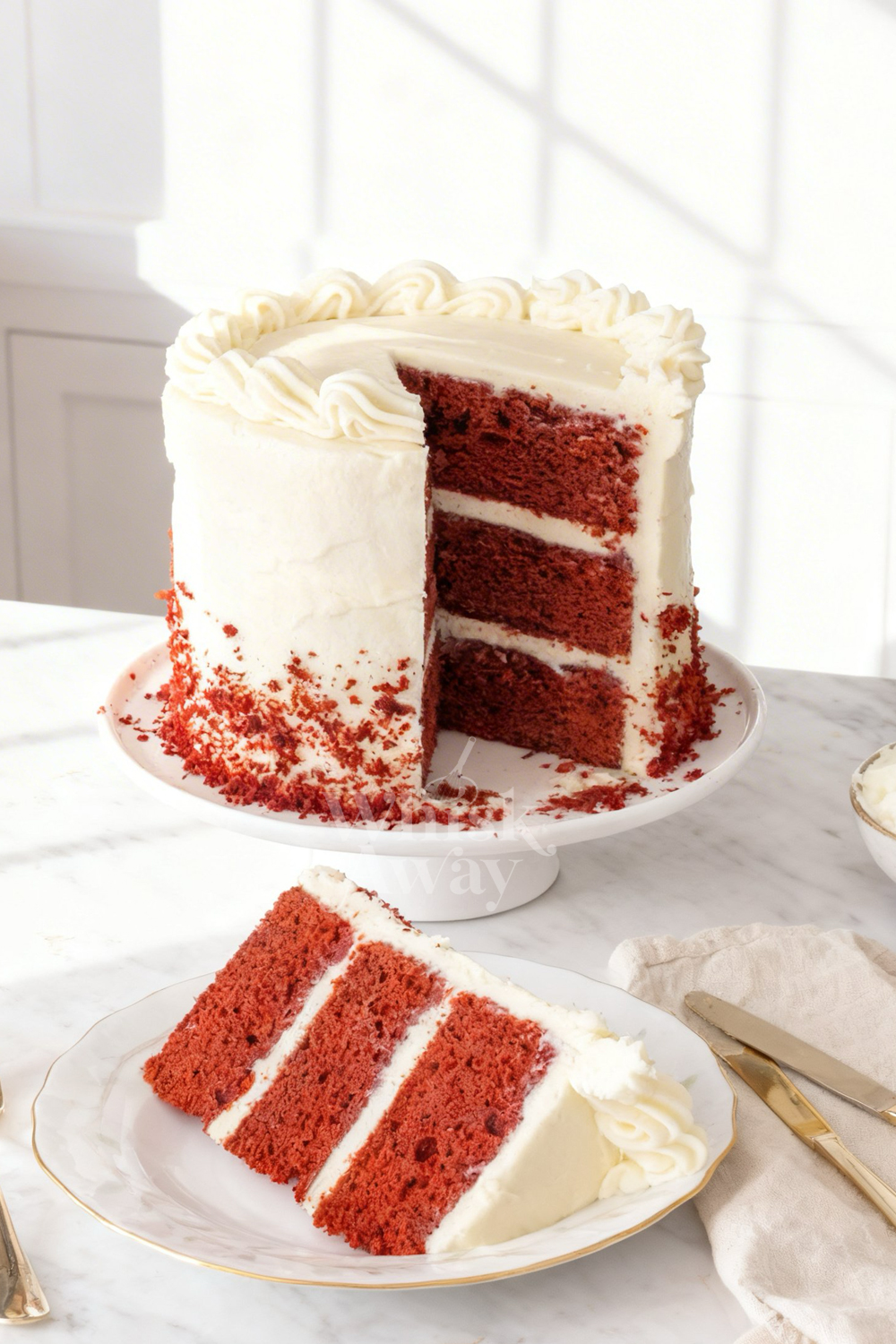 Red Velvet is a lean cake, meaning it doesn’t have as much fat as a heavy pound cake. It is very easy to over-bake. Check your cakes 5 minutes before the timer is set to go off. A toothpick should come out with a few moist crumbs attached. If it’s bone-dry, it’s been in too long. Also, ensure you are measuring your flour by spooning and leveling rather than scooping, as scooping packs too much flour into the cup.