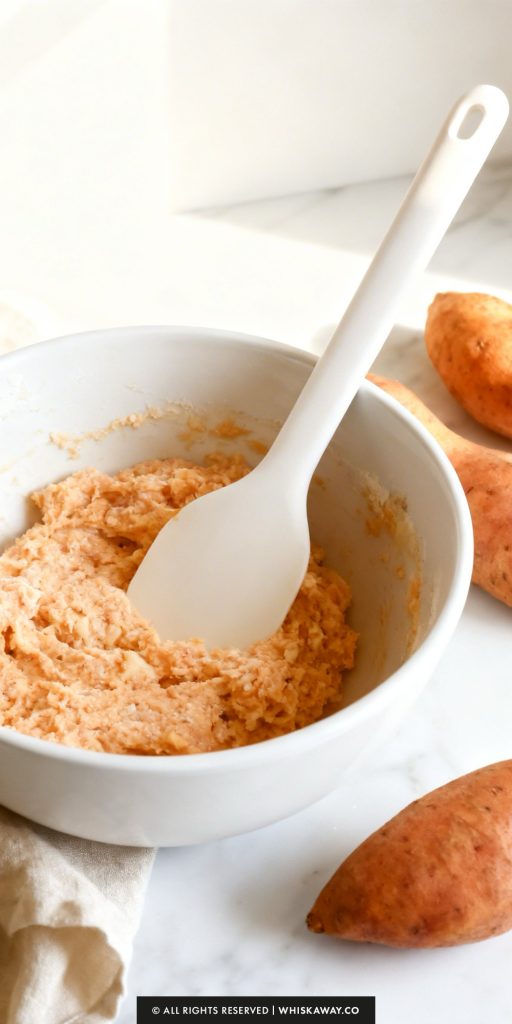 - In a large mixing bowl, combine the mashed sweet potatoes and ½ cup of milk. Stir until smooth and set aside.