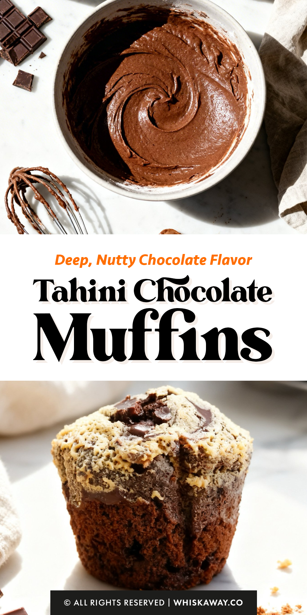 Keep your swirling motion near the top third of the muffin. If you swirl all the way to the bottom, the tahini flavor gets lost in the chocolate cake.